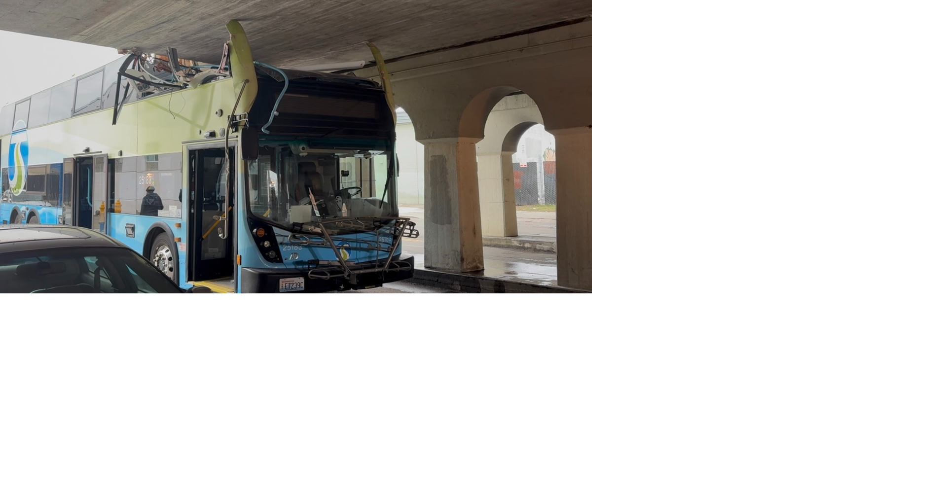 A double-decker Spokane Transit Authority bus with passengers apparently took the wrong street through downtown Sunday, causing it to crash into the downtown railroad viaduct overpass.