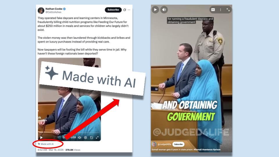 Does a video montage show real scenes of courtroom verdicts and repossessions related to Somali daycare fraud in Minnesota? No, that's not true: These videos are AI-generated ragebait. They are...