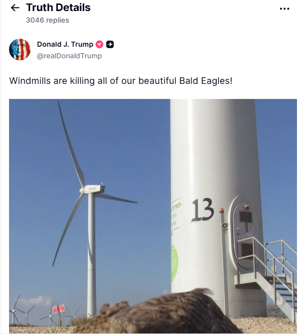 Does an image shared by President Trump in a Truth Social post that reads "Eagles going down!" show an American eagle killed by a wind turbine? No, that's not true:...